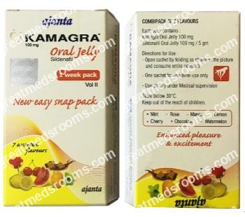 Kamagra Oral Jelly Vol-2 is a new easy snap pack including 7 assorted flavors: mint, rose, mango, lemon, cherry, chocolate and watermelon. Sildenafil is the main component of Kamagra Oral Jelly.